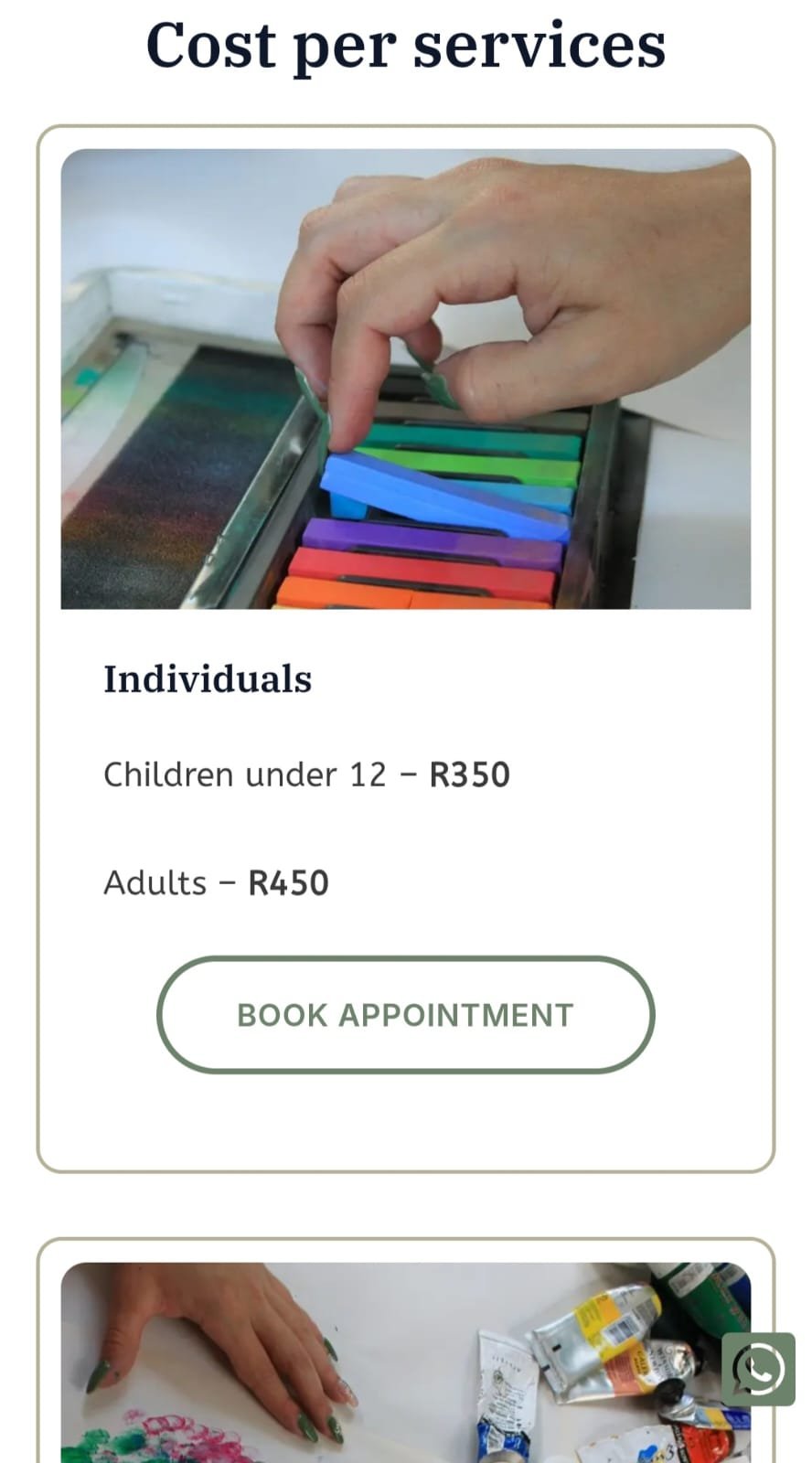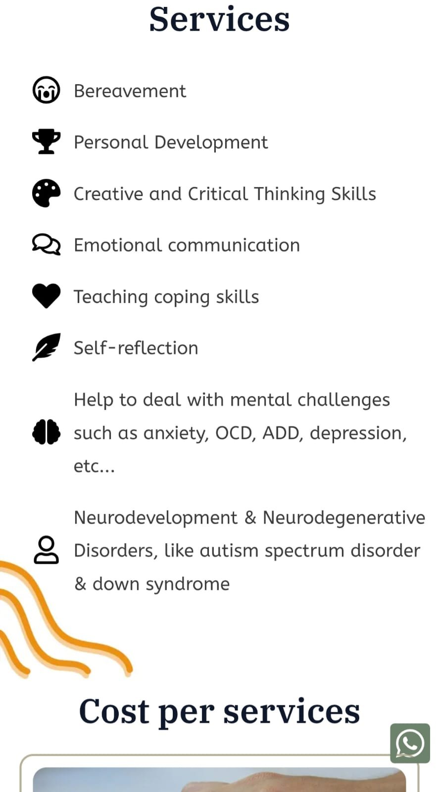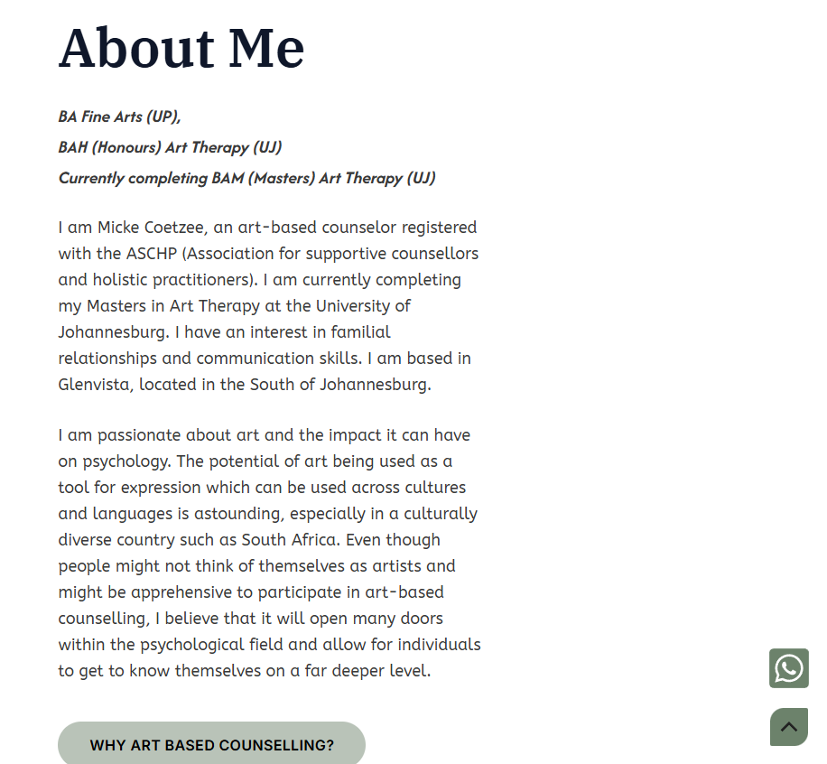 • To enhance usability and encourage action, I added sticky buttons on the right-hand side of the screen. One allows users to scroll back to the top of the page effortlessly, improving navigation on longer mobile screens. The other links directly to the client’s WhatsApp, providing a convenient way for potential clients to ask questions or book a session with just one tap—removing barriers and supporting quicker engagement.