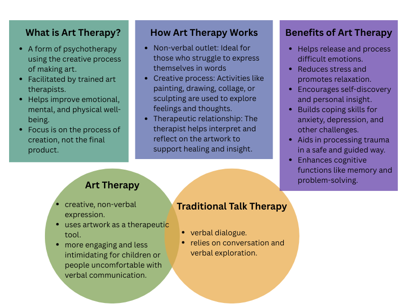 • Therapeutic Approach: Uses art-based counselling to support clients of all ages, particularly those who struggle with verbal expression