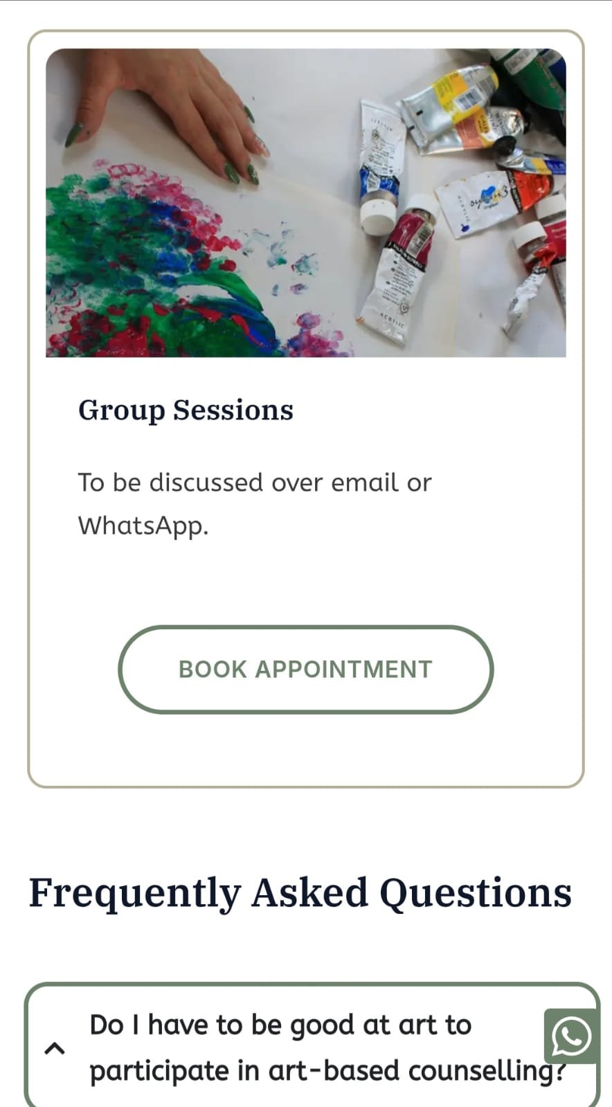 • Content Strategy Planning: I worked with the client to identify key information people would need to see quickly—what art-based counselling is, how it helps, how much it costs, and how to get in touch. We prioritized simplicity, breaking the content into digestible sections.
