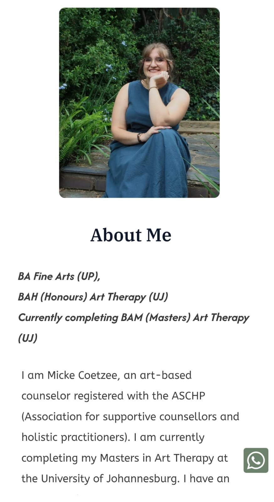 • Qualifications: BA Fine Arts (UP), Honours in Art Therapy (UJ), currently completing a Master’s in Art Therapy (UJ)